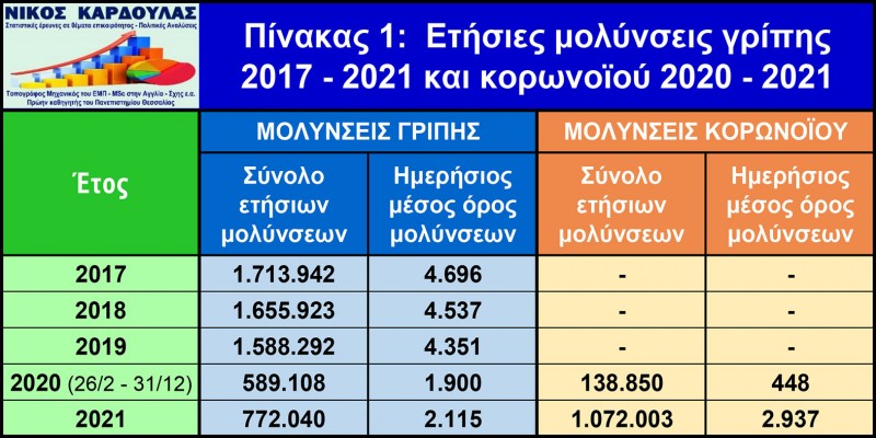 Στον παρακάτω πίνακα 1 απεικονίζονται οι συνολικές ετήσιες μολύνσεις από την εποχική γρίπη στην Ελλάδα την τελευταία πενταετία 2017-2021 και ο ημερήσιος μέσος όρος τους, σύμφωνα με στοιχεία του Οργανισμού Flus new Europe και οι συνολικές ετήσιες μολύνσεις από τον covid για το 2020 (από 26 Φεβρουαρίου 2020) και το 2021 και ο ημερήσιος μέσος όρος τους σύμφωνα με στοιχεία του ΕΟΔΥ. Για το 2020 οι μολύνσεις της γρίπης αναφέρονται στο χρονικό διάστημα από 26 Φεβρουαρίου μέχρι 31 Δεκεμβρίου 2020, για να είναι συγκρίσιμες με τις αντίστοιχες του κορωνοϊού.