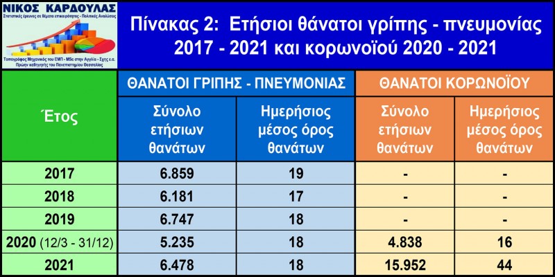 Στον παρακάτω πίνακα 2 απεικονίζονται οι συνολικοί ετήσιοι θάνατοι από την γρίπη και την πνευμονία στην Ελλάδα την τελευταία πενταετία 2017-2021 και ο ημερήσιος μέσος όρος τους, σύμφωνα με στοιχεία της ΕΛΣΤΑΤ, του ΠΟΥ και της παγκόσμιας εφαρμογής Worldlifeexpectancy και οι συνολικοί θάνατοι από τον covid για το 2020 (από 1 Μαρτίου 2020) και το 2021 και ο ημερήσιος μέσος όρος τους σύμφωνα με στοιχεία του ΕΟΔΥ. Για το 2020 οι θάνατοι λόγω της γρίπης και της πνευμονίας αναφέρονται στο χρονικό διάστημα από 12 Μαρτίου μέχρι 31 Δεκεμβρίου 2020, για να είναι συγκρίσιμες με τις αντίστοιχες του κορωνοϊού.