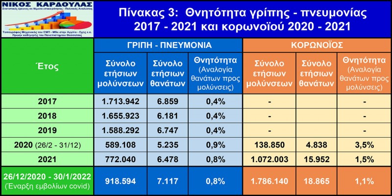 Στον παρακάτω πίνακα 3 απεικονίζεται η θνητότητα (αναλογία θανάτων προς μολύνσεις) λόγω της γρίπης και της πνευμονίας στην Ελλάδα την τελευταία πενταετία 2017-2021 και λόγω του κορωνοϊού για το 2020 (από 1 Μαρτίου 2020) και για το 2021, καθώς και η αντίστοιχη θνητότητα από την έναρξη των εμβολίων κορωνοϊού, από τον οποίο συμπεραίνεται: