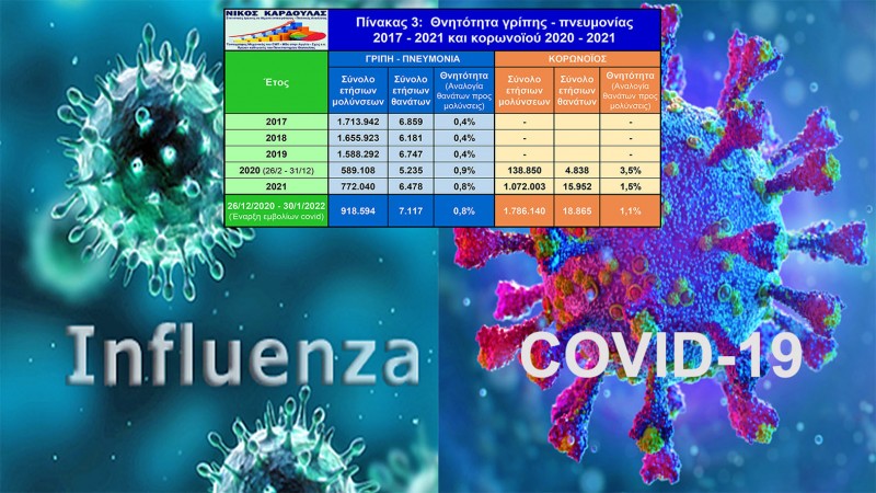 Στην παρούσα έρευνα παρουσιάζονται οι μολύνσεις της εποχικής γρίπης και οι θάνατοι λόγω γρίπης και πνευμονίας από το 2017 έως το 2021 στην Ελλάδα και οι αντίστοιχες μολύνσεις του κορωνοϊού το 2020 και το 2021 για σύγκριση, μέσα από επίσημα στοιχεία. Παρουσιάζεται επίσης η θνητότητα (αναλογία θανάτων προς μολύνσεις) λόγω της γρίπης και της πνευμονίας στην Ελλάδα την τελευταία πενταετία 2017-2021 και λόγω του κορωνοϊού για το 2020 και το 2021, καθώς και η αντίστοιχη θνητότητα από την έναρξη των εμβολίων κορωνοϊού. Τα στοιχεία προέρχονται από τον Παγκόσμιο Οργανισμό Υγείας (ΠΟΥ), τον Ευρωπαϊκό Οργανισμό Flu News Europe, τον Εθνικό Οργανισμό Δημόσιας Υγείας (ΕΟΔΥ) της Ελλάδας, την ΕΛΣΤΑΤ και την παγκόσμια εφαρμογή Worldlifeexpectancy.
