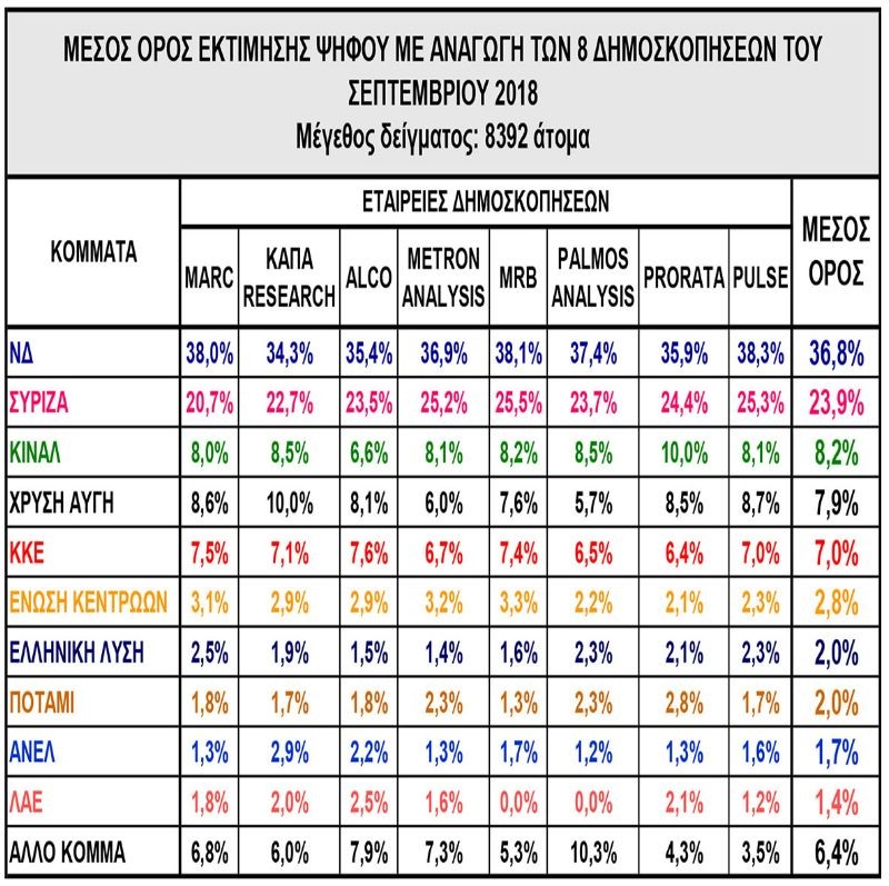 Για την παρούσα ανάλυση ελήφθησαν υπόψη οι έρευνες οκτώ εταιρειών, που δημοσιεύθηκαν τον τρέχοντα μήνα και συγκεκριμένα των εταιρειών Alco, Kαπα Research, Marc, Metron Analysis, Mrb, Palmos Analysis, Prorata και Pulse, όπου το συνολικό μέγεθος δείγματος ήταν 8.392 άτομα. Για την τελική εκτίμηση του εκλογικού αποτελέσματος, υπολογίσθηκε πρώτα η εκτίμηση ψήφου με αναγωγή επί των έγκυρων και των αναποφάσιστων των παραπάνω εταιρειών και στη συνέχεια ο μέσος όρος τους, όπως φαίνεται στον παρακάτω πίνακα και γράφημα.