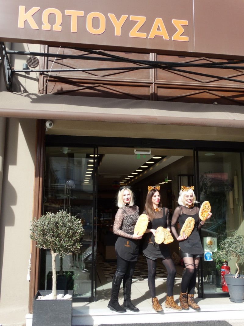Οι πωλήτριες ντυμένες… γατούλες υποδέχονται τον κόσμο με χαμόγελο προσφέροντας τα προϊόντα του καταστήματος. Φυσικά οι λαγάνες δεν θα μπορούσαν παρά να βρίσκονται σε πρώτο πλάνο, αφού θα αποτελέσουν το κυρίαρχο προϊόν στο σαρακοστιανό τραπέζι…