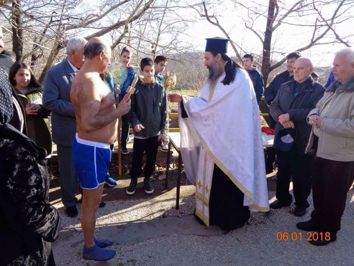 Στο ποτάμι που περνά δίπλα από το χωριό, ο ιερέας π. Αχίλλειος έριξε τον τίμιο σταυρό για τον αγιασμό των υδάτων με τον κ. Ζήση Τσίτσαρη να βουτά, αψηφώντας το κρύο.