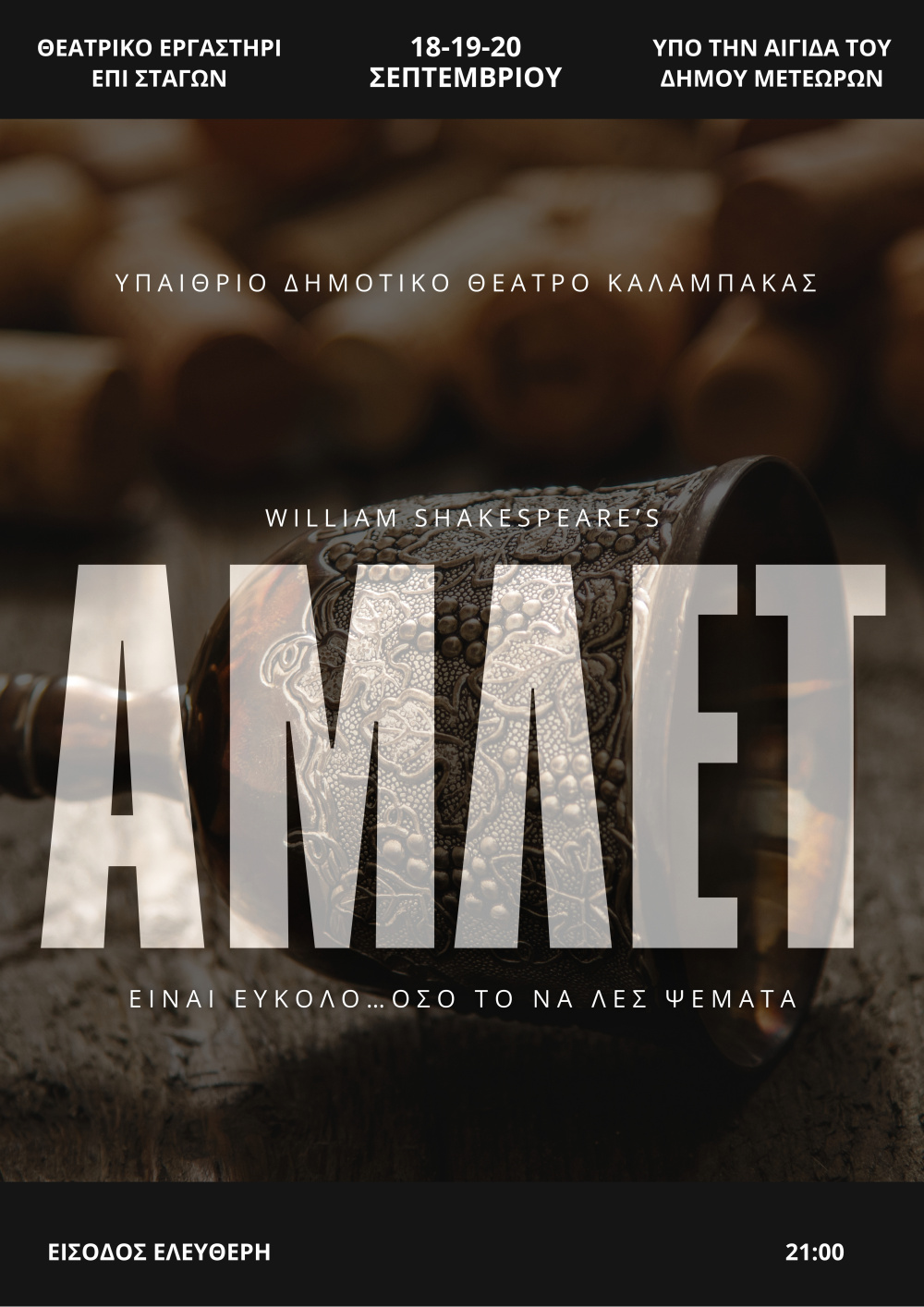 Το Θεατρικό Εργαστήρι «Επί Σταγών» παρουσιάζει ένα από τα σπουδαιότερα έργα της παγκόσμιας δραματουργίας: τον Άμλετ του Ουίλλιαμ Σαίξπηρ.