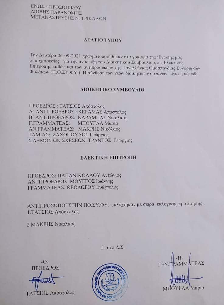 Την Δευτέρα 06-09-2021 πραγματοποιήθηκε η εκλογική διαδικασία της ” Ένωσης Προσωπικού Δίωξης Παράνομης Μετανάστευσης Ν. Τρικάλων”.
