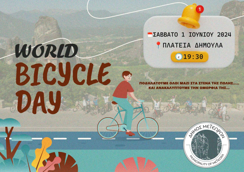 Συμμετέχοντας στον εορτασμό για την Παγκόσμια Ημέρα Ποδηλάτου που είναι η 3η Ιουνίου, ο Δήμος Μετεώρων το Σάββατο 1 Ιουνίου διοργανώνει απογευματινή ποδηλατάδα. Με αφετηρία την πλατεία Δημουλά στις 19:30 το απόγευμα ξεκινάμε και κάνουμε μια όμορφη βόλτα στις γειτονιές της Καλαμπάκας και στα ριζά των Μετεώρων.