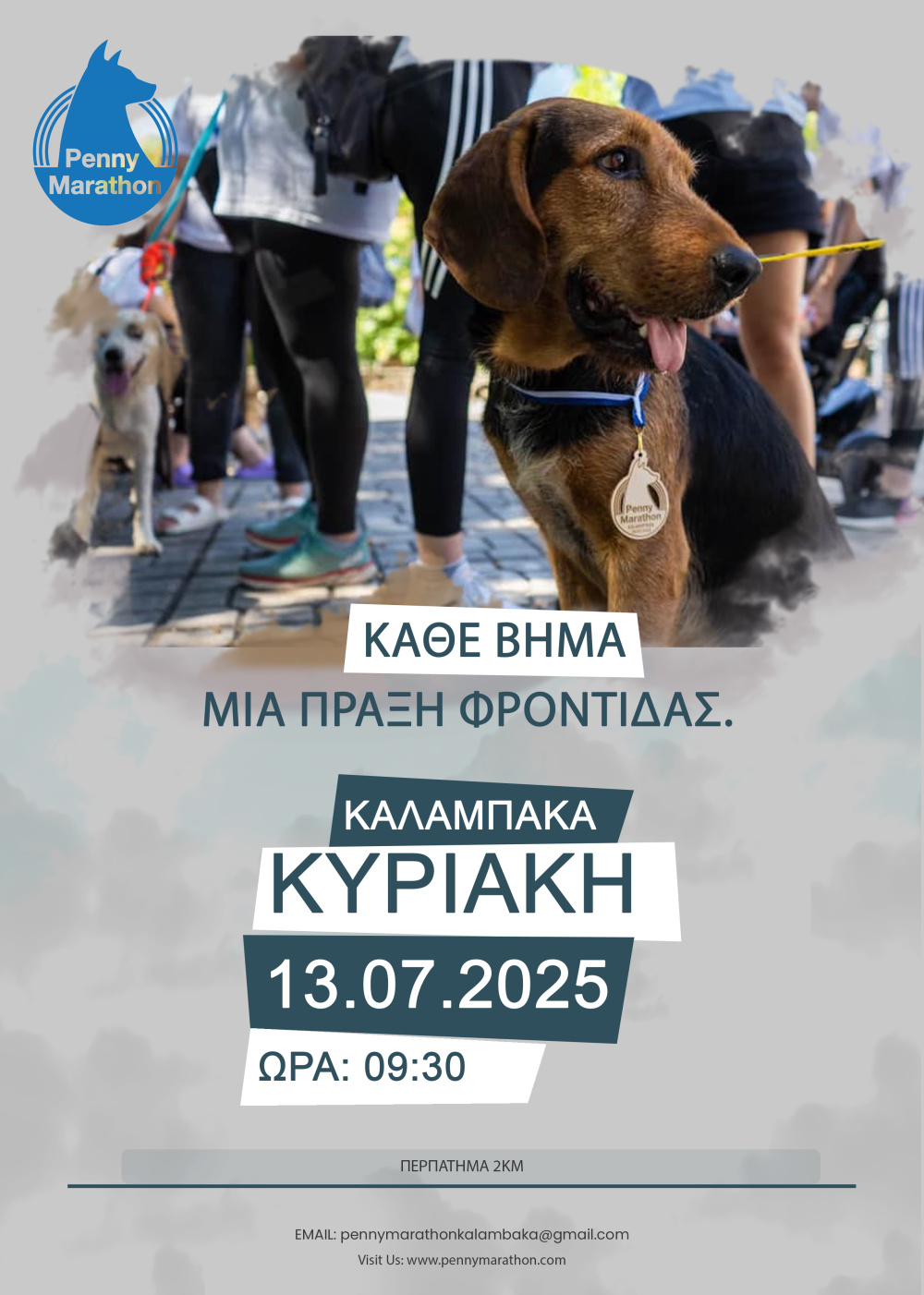 Η φετινή διοργάνωση θα πραγματοποιηθεί την Κυριακή 13 Ιουλίου 2025, με ώρα εκκίνησης στις 10:30 το πρωί, από την Πλατεία Δημουλά στην Καλαμπάκα. Η διαδρομή είναι συμβολική, 2 χιλιομέτρων, και είναι ανοιχτή για όλους – πεζούς, δρομείς, ποδηλάτες, οικογένειες και φυσικά τετράποδους φίλους! Ο τερματισμός θα πραγματοποιηθεί επίσης στην Πλατεία Δημουλά.