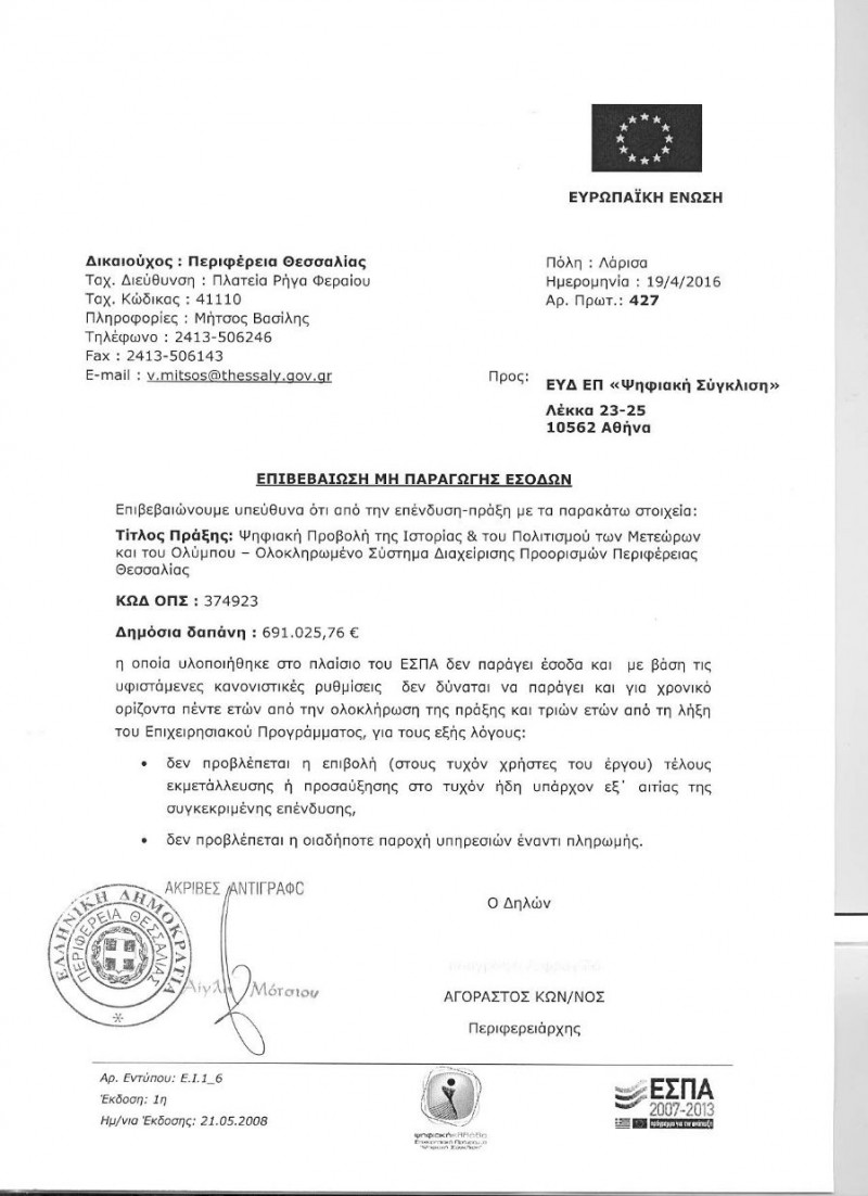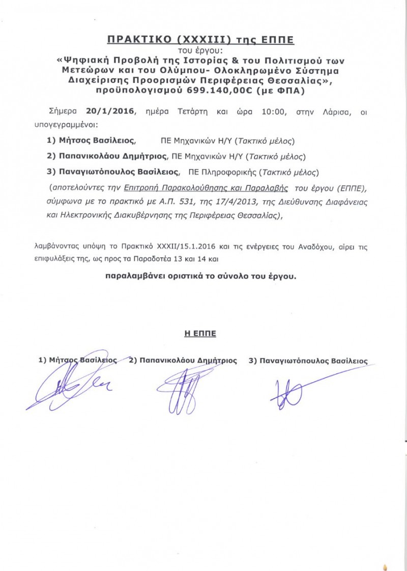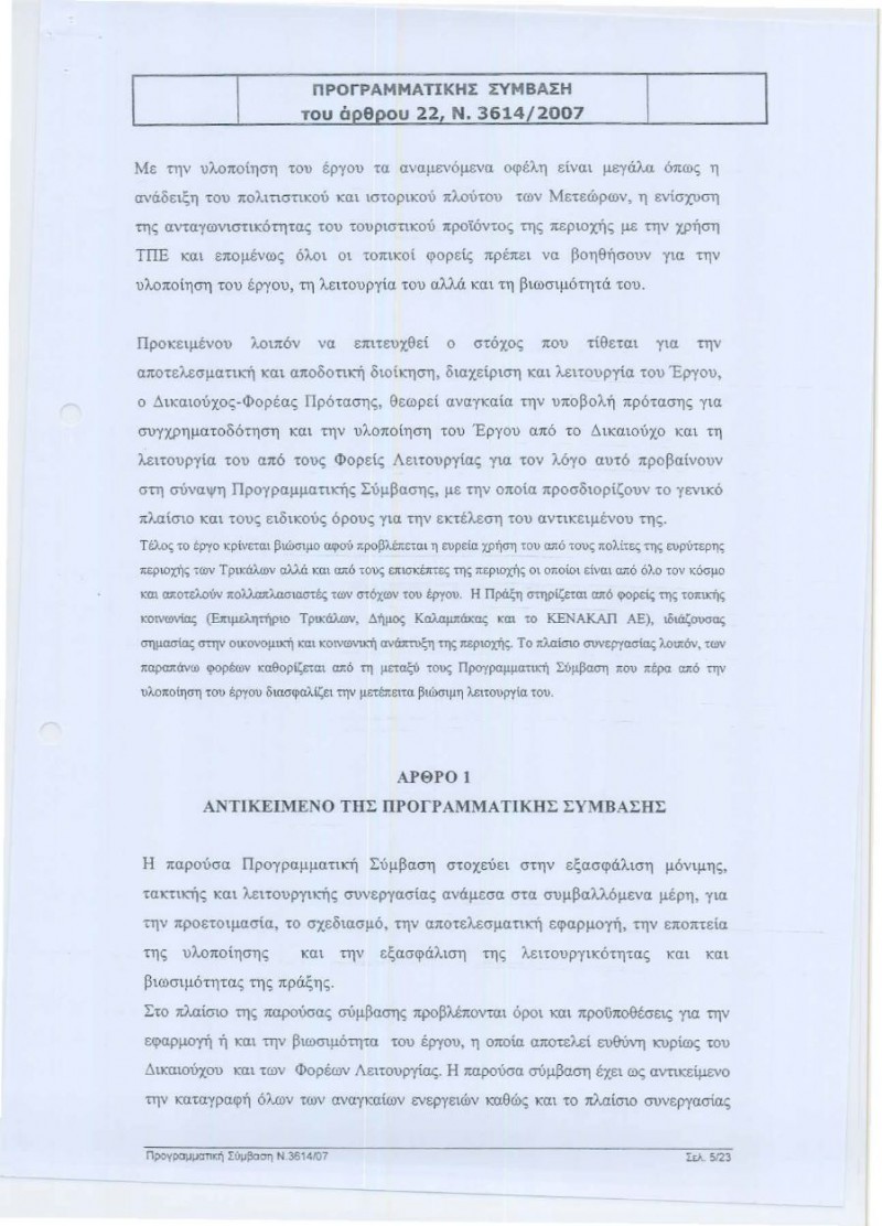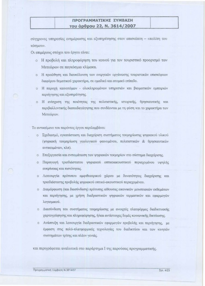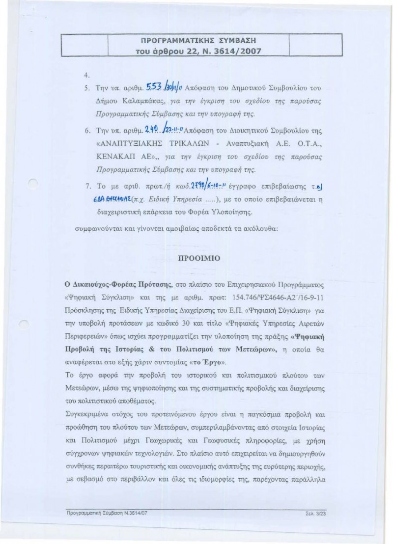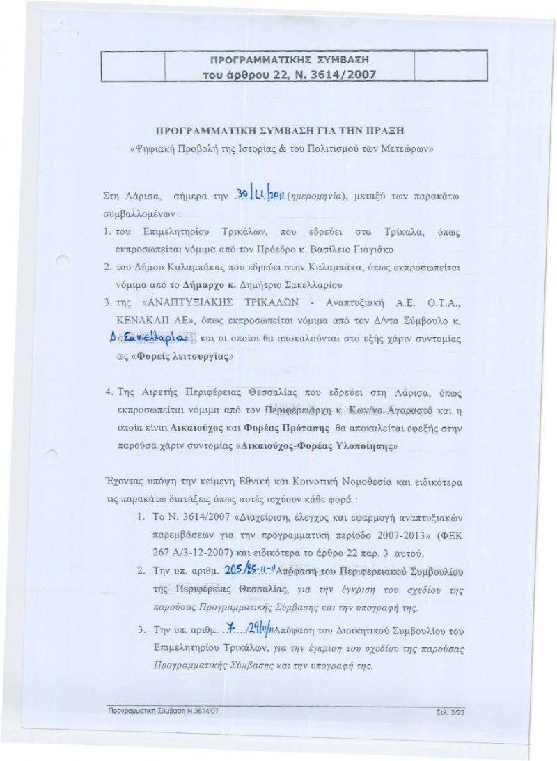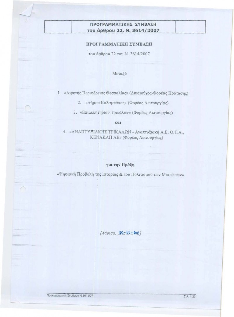 – Το έργο ΄΄ Ψηφιακή Προβολή της Ιστορίας και του Πολιτισμού των Μετεώρων ΄΄ συμβασιοποιήθηκε το 2011 από  τον Περιφερειάρχη Θεσσαλίας κ. Κώστα Αγοραστό ,  τον Δήμαρχο Μετεώρων κ. Δημήτρη Σακελλαρίου και τον Πρόεδρο του Επιμελητηρίου Τρικάλων κ. Βασίλη Γιαγιάκο .