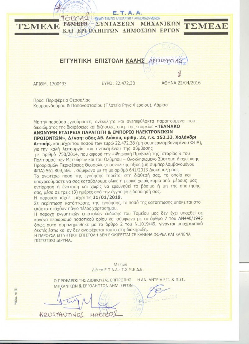 – Σημειώνεται δε ότι η εγγύηση καλής λειτουργίας του έργου παρήλθε στις  31/01/2019 .
