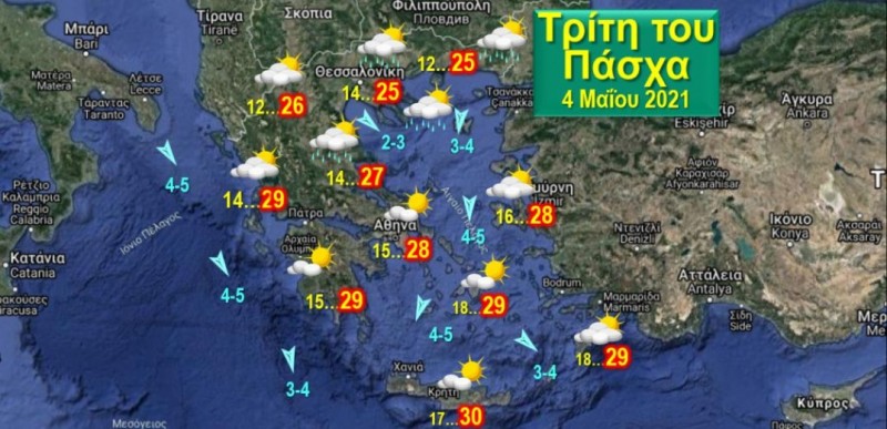 Άνεμοι, Βοριάδες, 3-5 Μποφόρ. Θερμοκρασίες, στη βόρεια χώρα από 12 έως 26, στο Ιόνιο, τη δυτική, κεντρική και νότια χώρα από 14 έως 29, στο βόρειο και ανατολικό Αιγαίο από 16 έως 28, στις Κυκλάδες, την Κρήτη και τα Δωδεκάνησα από 16 έως 30 βαθμούς.