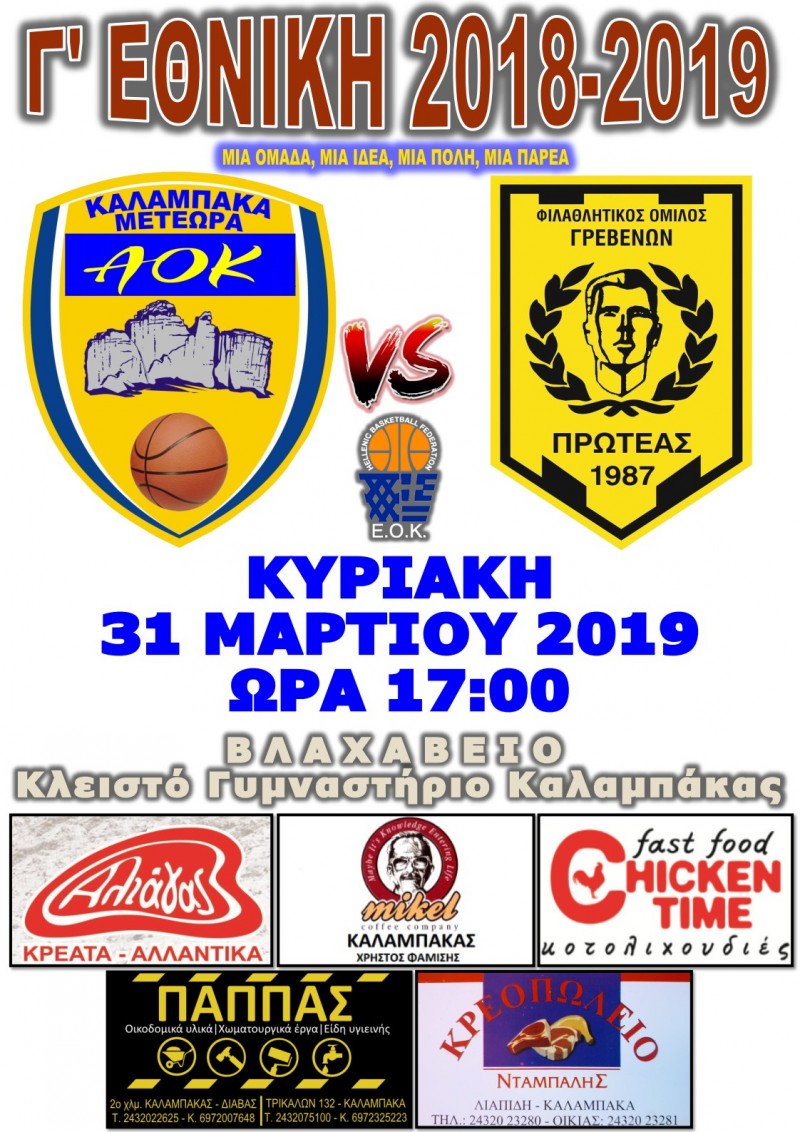 Την Κυριακή 31 Μαρτίου στις 17:00 το απόγευμα η ομάδα του Α.Ο. Καλαμπάκας υποδέχεται τον Πρωτέα Γρεβενών στο κλειστό Βλαχάβειο Γυμναστήριο.