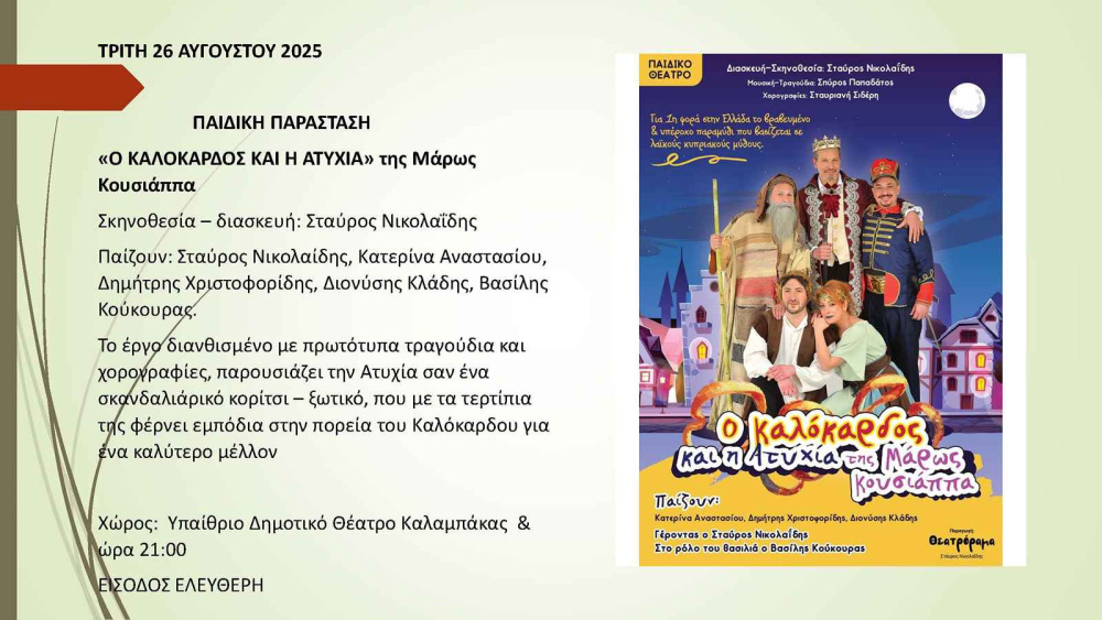 O Δήμος Μετεώρων, στο πλαίσιο του πολιτιστικού θεσμού Μετέωρα Τέχνης 2025», προσκαλεί μικρούς και μεγάλους στην παιδική θεατρική παράσταση «Ο Καλόκαρδος και η Ατυχία» της Μάρως Κουσιάππα, την Τρίτη 26 Αυγούστου 2025 και ώρα 21:00, στο Υπαίθριο Δημοτικό Θέατρο Καλαμπάκας.