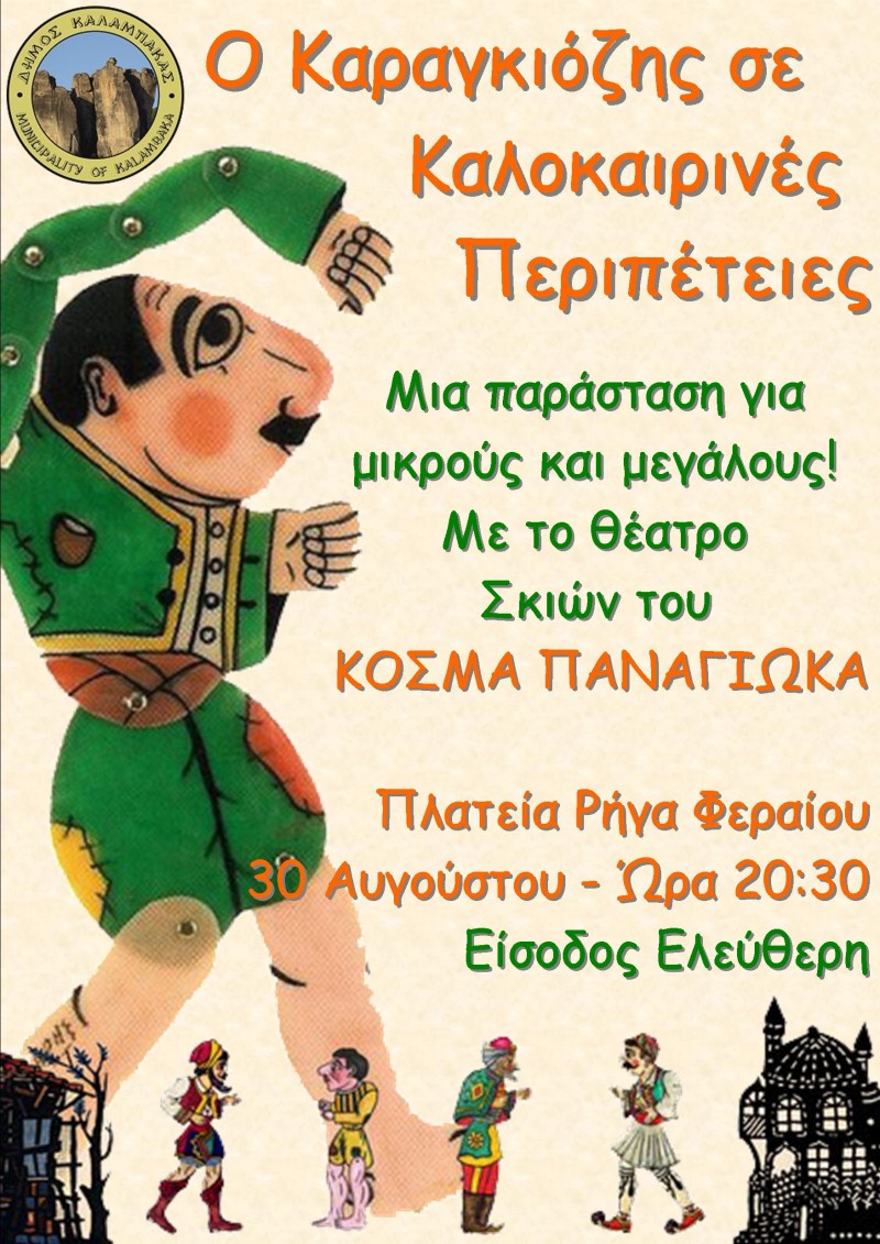 Οι εκδηλώσεις του Μετέωρα Τέχνης 2018, συνεχίζονται σήμερα Πέμπτη 30 Αυγούστου στις 20:30, στην πλατεία Ρήγα Φεραίου, όπου θα πραγματοποιηθεί η παράσταση θεάτρου σκιών του Κοσμά Παναγιώκα «Ο Καραγκιόζης σε καλοκαιρινές περιπέτειες».