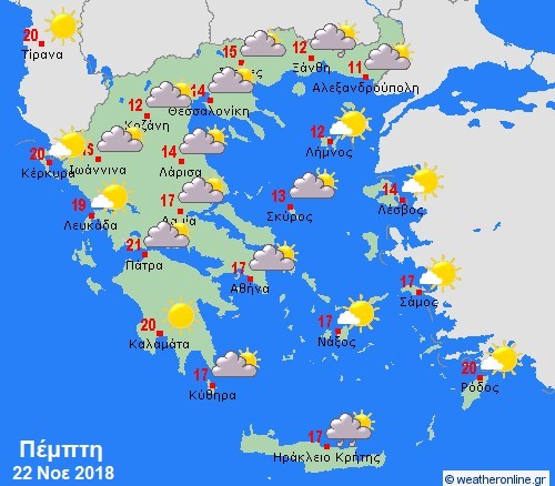 Συννεφιά με ασθενή βροχή στα βόρεια. Οι άνεμοι βορειοανατολικοί, μέτριοι 3-5 Μποφόρ, στα ανατολικοί ισχυροί 6 Μποφόρ. Η θερμοκρασία από 12 έως 20 βαθμούς.