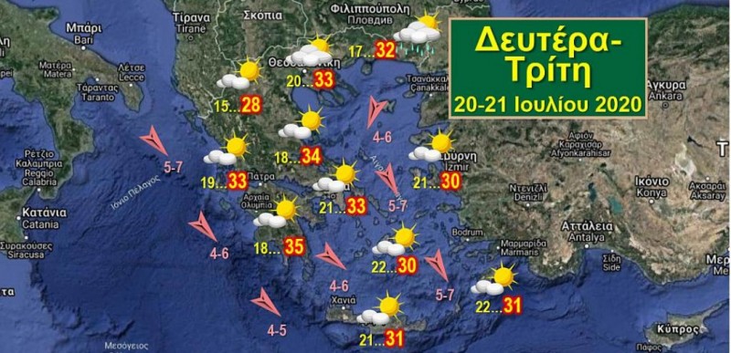 Δευτέρα – Τρίτη 20-21/7/2020 Καλός καιρός, αίθριος σ΄ όλη τη χώρα, εξαίρεση η ανατολική Μακεδονία και η Θράκη με τοπική συννεφιά και πιθανές λίγες βροχές το απόγευμα της Δευτέρας.