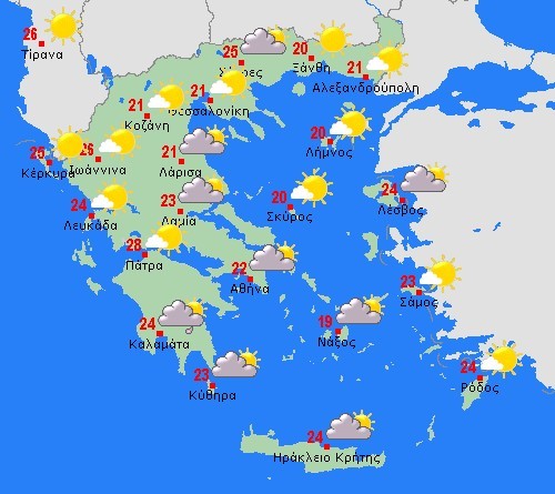 Ηλιοφάνεια με τοπική συννεφιά στο μεγαλύτερο μέρος της χώρας. Από το μεσημέρι αυξημένη συννεφιά με λίγες τοπικές βροχές ή καταιγίδες στα ορεινά της Ηπείρου, Δυτικής Μακεδονίας, Θεσσαλίας, Στερεάς και Πελοποννήσου. Αυξημένη μεταφορά αφρικανικής σκόνης. Άνεμοι, στο Ιόνιο νοτιοανατολικοί μέτριοι έως πολύ ισχυροί 5-7 Μποφόρ, στο Αιγαίο βορειοανατολικοί μέτριοι 3-5 Μποφόρ. Η θερμοκρασία σε μικρή άνοδο.