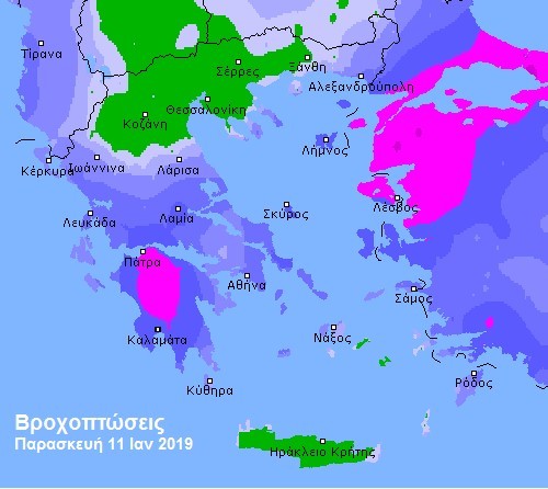 Στη Μακεδονία και στη Θράκη βελτιωμένος καιρός με ηλιοφάνεια, λίγες νεφώσεις και τοπικές ομίχλες τις πρωινές ώρες. Στα ορεινά και σε ημιορεινά της Ηπείρου, της Θεσσαλίας και της Στερεάς, τοπικές χιονοπτώσεις, ενώ στο Ιόνιο και στο Αιγαίο βροχές και σποραδικές καταιγίδες. Παγετός τις νυχτερινές και πρωινές ώρες στα βόρεια και κεντρικά ηπειρωτικά.