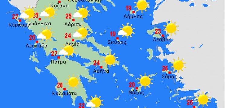 Στη Βόρεια και Κεντρική Ελλάδα από 12 έως 24 βαθμούς, στην Ήπειρο και στη Δυτική Μακεδονία 2-5 βαθμούς χαμηλότερη, στη Δυτική και Νότια Ελλάδα από 14 έως 27 και στις νησιωτικές περιοχές από 15 έως 26 βαθμούς.