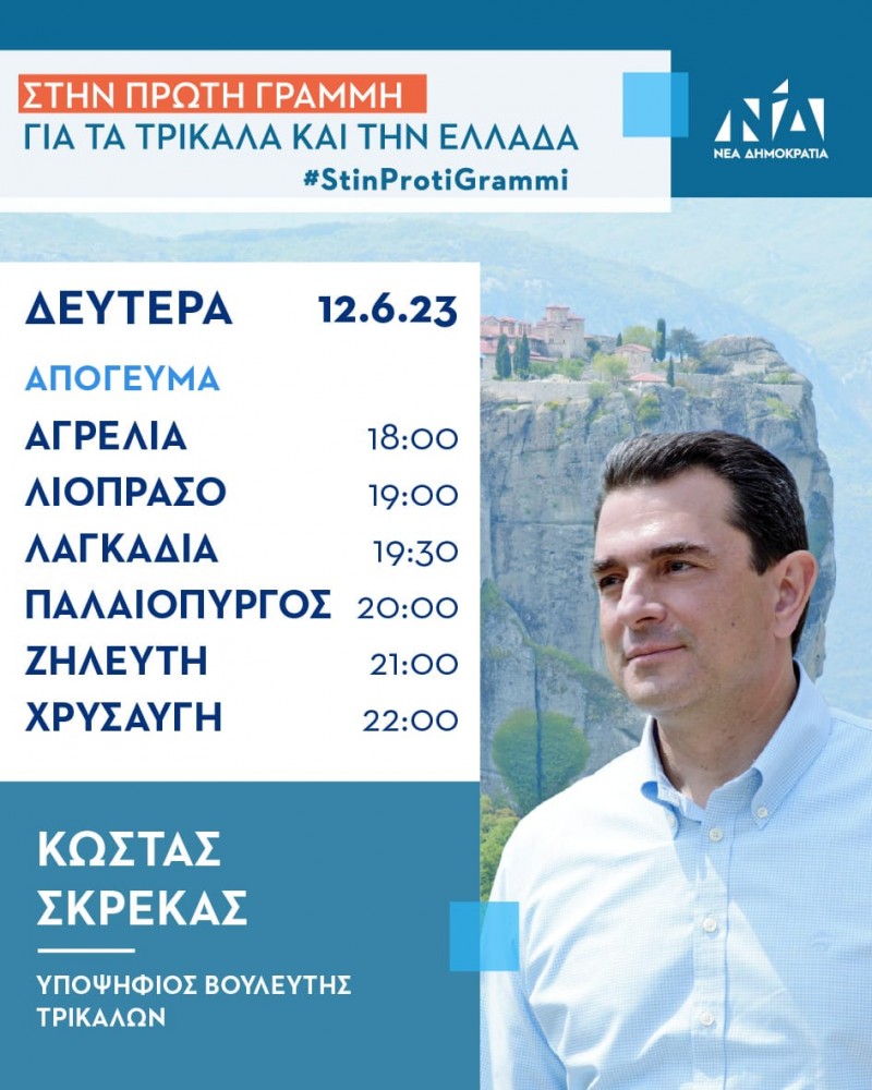 Ο Κώστας Σκρέκας, τη Δευτέρα 12 Ιουνίου, το απόγευμα, θα επισκεφθεί τα ακόλουθα χωριά: