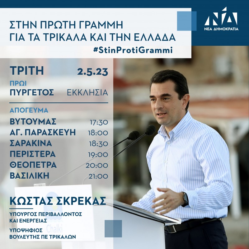 Ο Υπουργός Περιβάλλοντος και Ενέργειας και υποψήφιος βουλευτής Π.Ε. Τρικάλων, Κώστας Σκρέκας, την Τρίτη 2 Μαΐου, θα επισκεφθεί τα ακόλουθα χωριά: