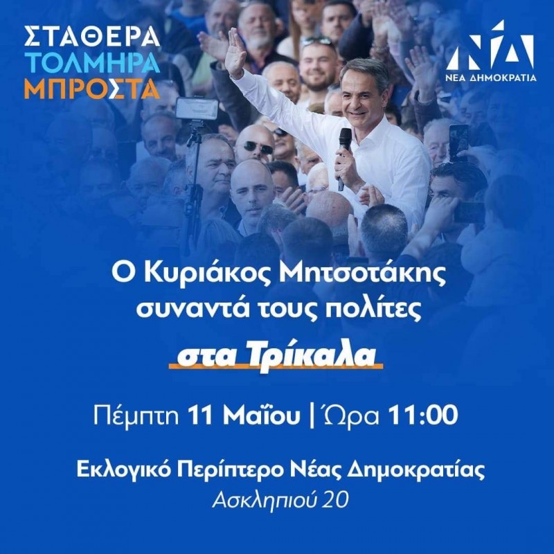 Την Πέμπτη 11 Μαΐου στις 11 πμ θα βρίσκεται στα Τρίκαλα ο Πρωθυπουργός και Πρόεδρος της ΝΔ Κυριάκος Μητσοτάκης .