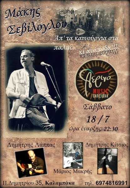 Ο Μάκης Σεβιλογλου με τους Δημήτρη Λαππα, Δημητρη Κιτσιο και Μάριο Μακρη απόψε Σάββατο 18 Ιουλίου στο μουσικό καφέ ΑΕΡΙΝΟ της πόλης μας,