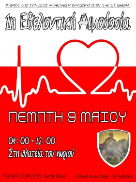 Ο Μορφωτικός Σύλλογος των Απανταχού Κρυοβρυσιωτών, σας ενημερώνει ότι πρόκειται να δημιουργηθεί Τράπεζα αίματος και γι’ αυτό το λόγο καλεί τα μέλη του συλλόγου για εθελοντική αιμοδοσία που ορίστηκε την 9η Μαΐου 2013, ημέρα Πέμπτη, στη πλατεία του χωριού, ώρες 09:00 – 12:00.