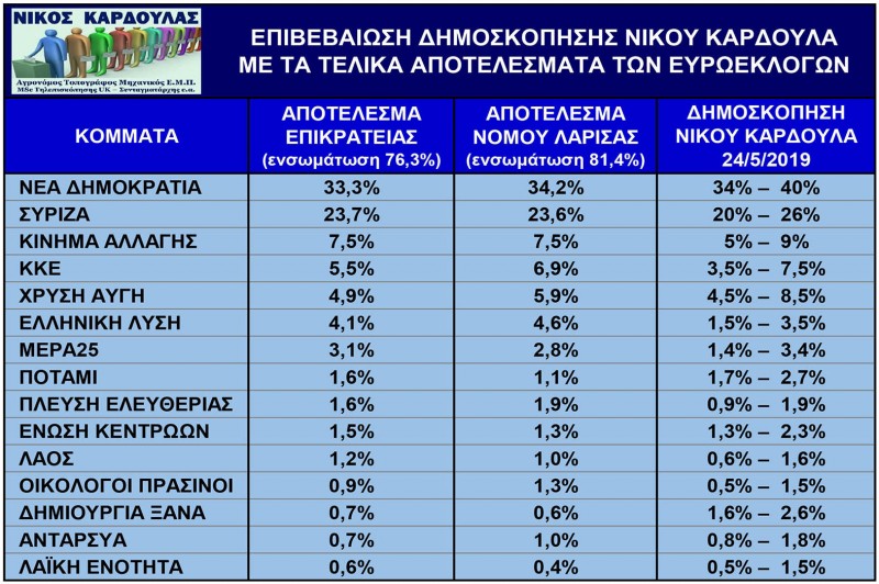 Η συγκεκριμένη δημοσκοπική έρευνα πραγματοποιήθηκε με δείγμα το Νομό Λάρισας από 21 έως 23 Μαΐου 2019, ο οποίος για μία ακόμη φορά αποδεικνύεται πολιτικό βαρόμετρο και για την επικράτεια και δημοσιοποιήθηκε στις 24 Μαΐου 2019 σε όλα τα έντυπα και ηλεκτρονικά μέσα της Θεσσαλίας, καθώς και σε μερικά ΜΜΕ ανά την Ελλάδα.