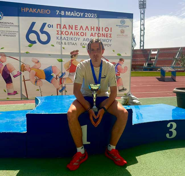 Το Σχολείο μας εκφράζει τα θερμά του συγχαρητήρια στον μαθητή μας Παναγιώτη Σάλτη για την εξαιρετική του επίδοση στο Πανελλήνιο Σχολικό Πρωτάθλημα στο Ηράκλειο της Κρήτης.