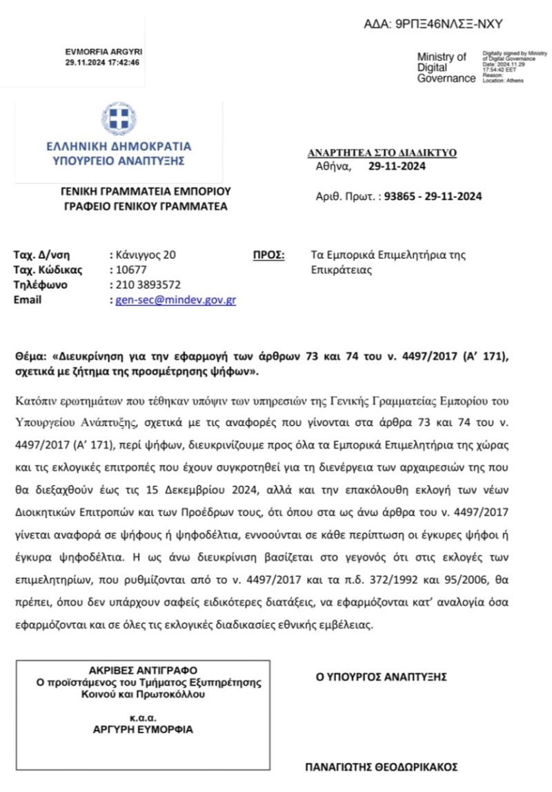 Τέλος στα σενάρια που μέχρι σήμερα διακινούνταν σχετικά με την εγκυρότητα των αποτελεσμάτων στις εκλογές του Επιμελητηρίου Τρικάλων βάζει νέα διευκρινιστική εγκύκλιος που εκδόθηκε χθες Παρασκευή 29 Νοεμβρίου 2024 από τον Υπουργό Ανάπτυξης κ. Τάκη Θεοδωρικάκο.