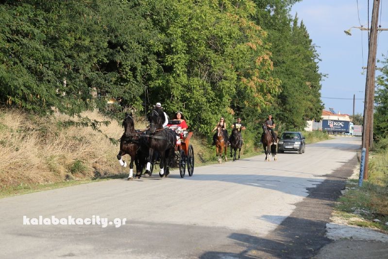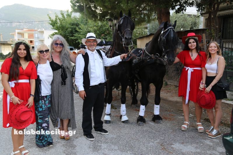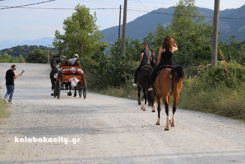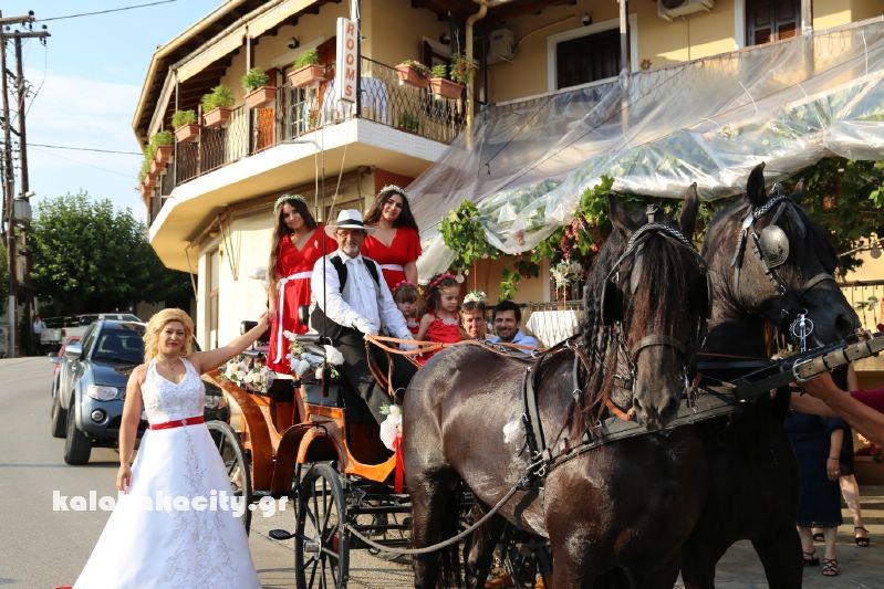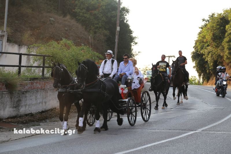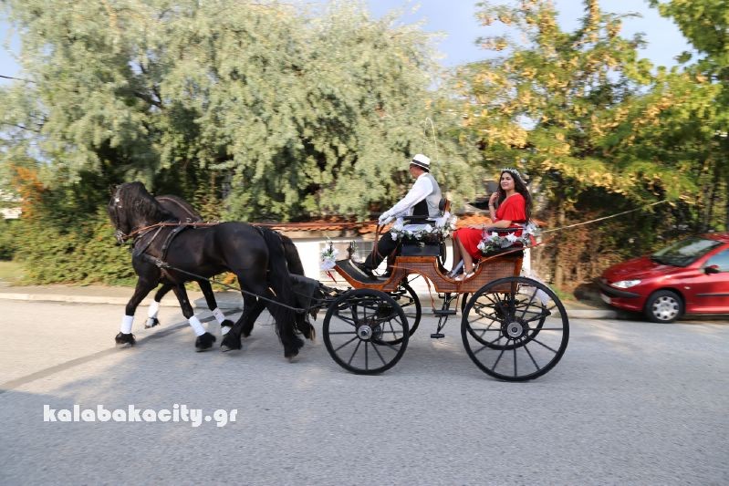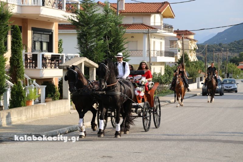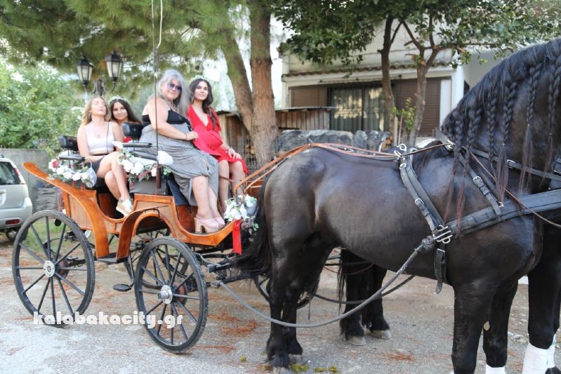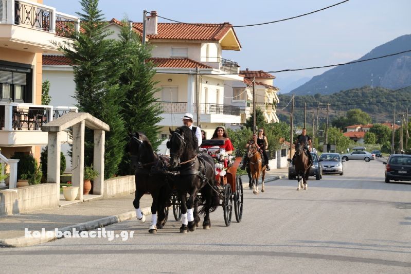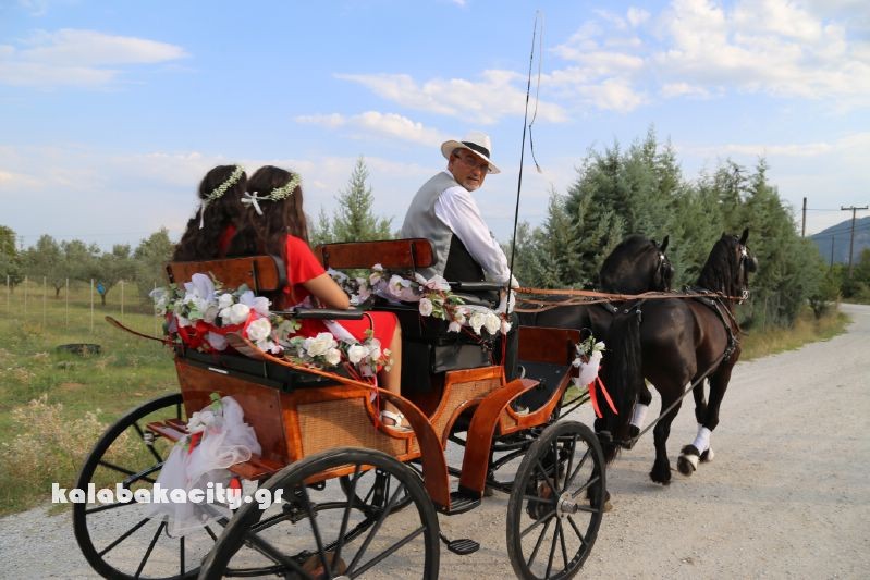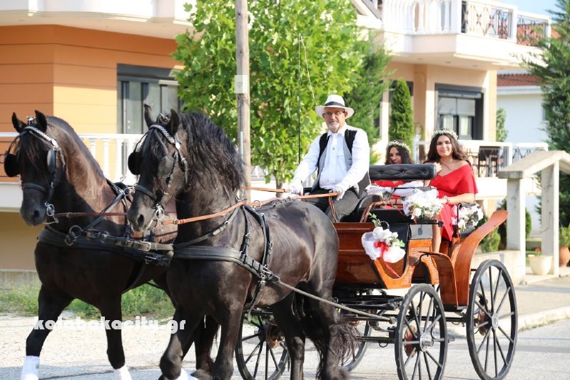 Άμαξα ειδικά στολισμένη έφτασε στο σπίτι της Στέλλας την οποία συνόδευαν με κόκκινες ενδυμασίες οι εντυπωσιακές Κωνσταντίνα – Μαρία και Άννα – Ελευθερία Τζιουβάρα καθώς και φίλοι του ζευγαριού με τα άλογά τους.