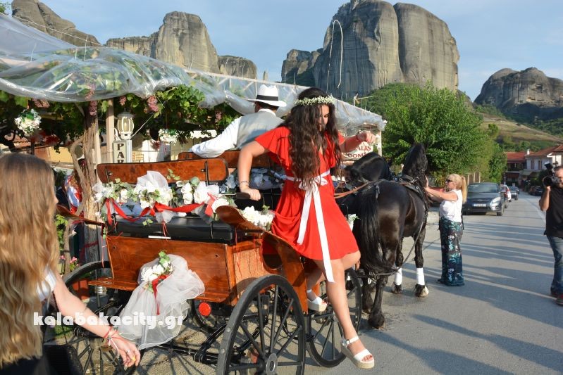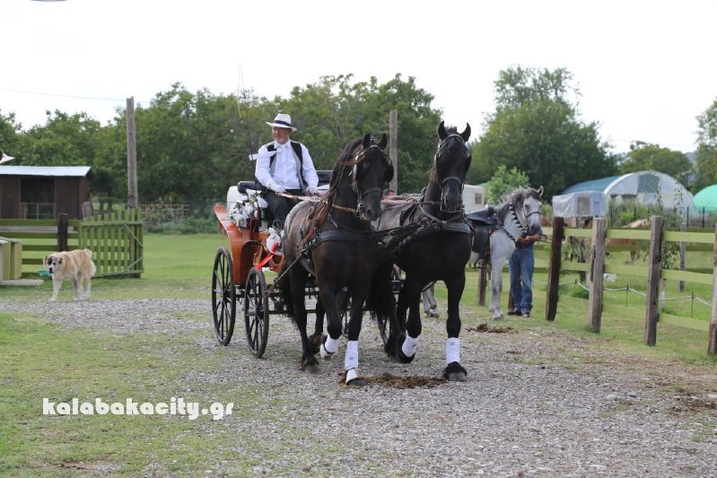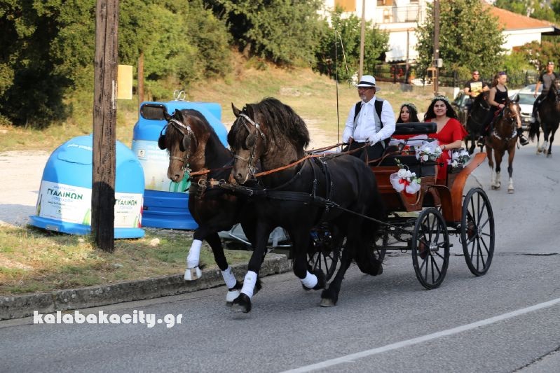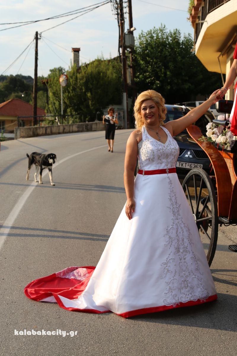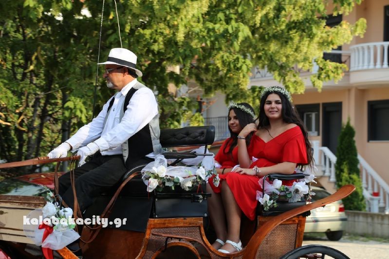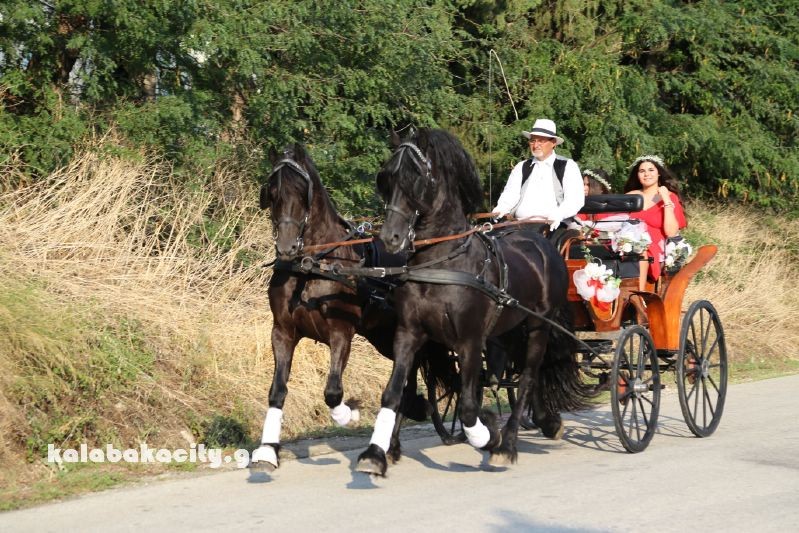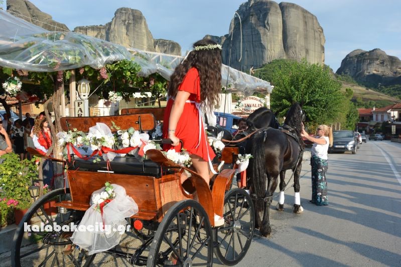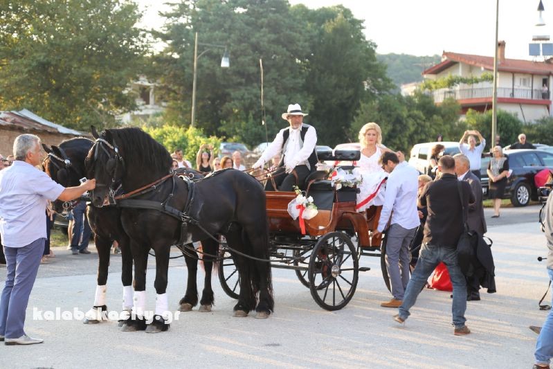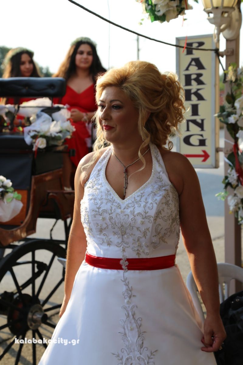 Άμαξα ειδικά στολισμένη έφτασε στο σπίτι της Στέλλας την οποία συνόδευαν με κόκκινες ενδυμασίες οι εντυπωσιακές Κωνσταντίνα – Μαρία και Άννα – Ελευθερία Τζιουβάρα καθώς και φίλοι του ζευγαριού με τα άλογά τους.