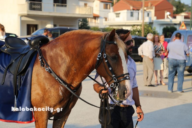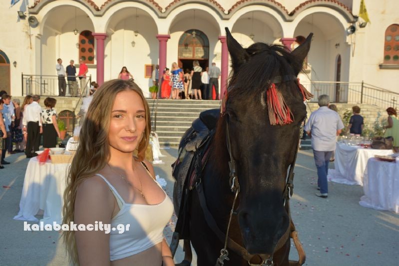 Οι νεόνυμφοι έφτασαν στην εκκλησιά με τα άλογά τους, με ανάλογο στολισμό και ενδυμασία που επιμελήθηκε ο Οίκος Νυφικών ΣΟΦΗ της Σοφίας Μαύρου Τζιουβάρα.