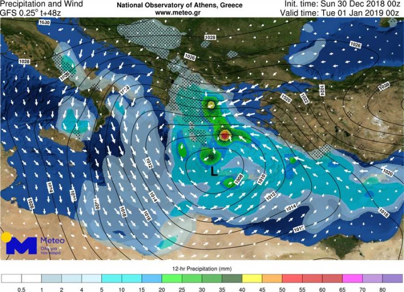 Την Τρίτη 01/01/2019, η κακοκαιρία θα συνεχιστεί, με ισχυρά φαινόμενα στα ανατολικά και νότια ηπειρωτικά τμήματα (συμπεριλαμβανομένης της Αττικής), στις Σποράδες, στις Κυκλάδες, στην Κρήτη και στα Δωδεκάνησα, ενώ στη Δυτική και Βόρεια Ελλάδα ο καιρός θα παρουσιάσει προοδευτική βελτίωση.