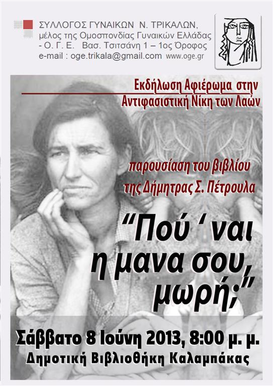 Ο Σύλλογος Γυναικών Ν. Τρικάλων, μέλος της Ομοσπονδίας Γυναικών Ελλάδας , διοργανώνει το Σάββατο 8 Ιούνη 2013, στις 8:00 το απόγευμα, στην Δημοτική Βιβλιοθήκη της Καλαμπάκας εκδήλωση μνήμης και τιμής για την Μεγάλη Αντιφασιστική Νίκη των Λαών.