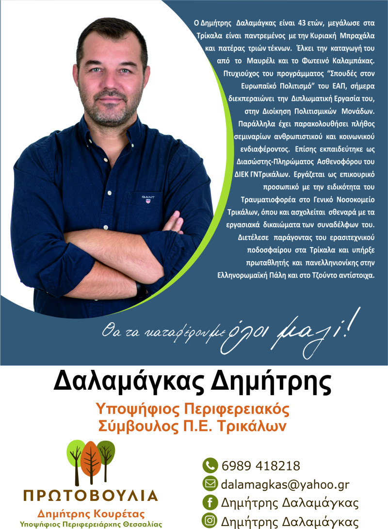 Ο Δημήτρης Δαλαμάγκας είναι Υποψήφιος Περιφερειακός Σύμβουλος Π.Ε Τρικάλων με τον Δημήτρη Κουρέτα και τον Συνδυασμό ΠΡΩΤΟΒΟΥΛΙΑ