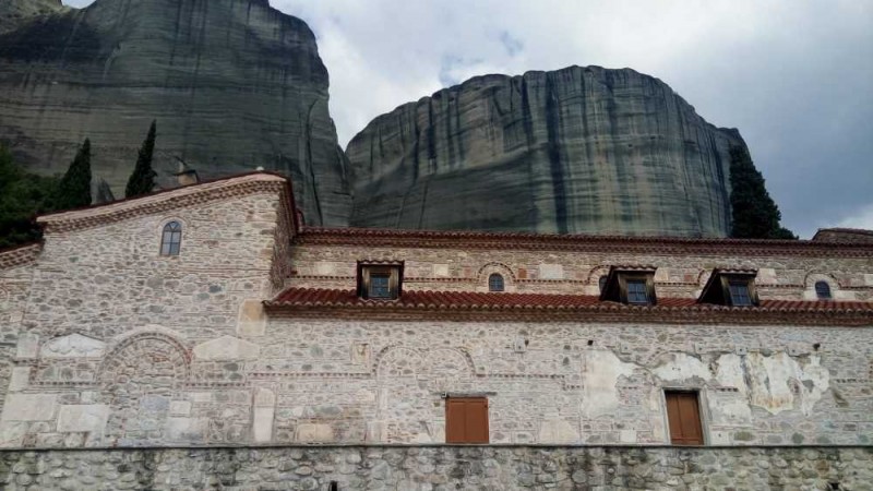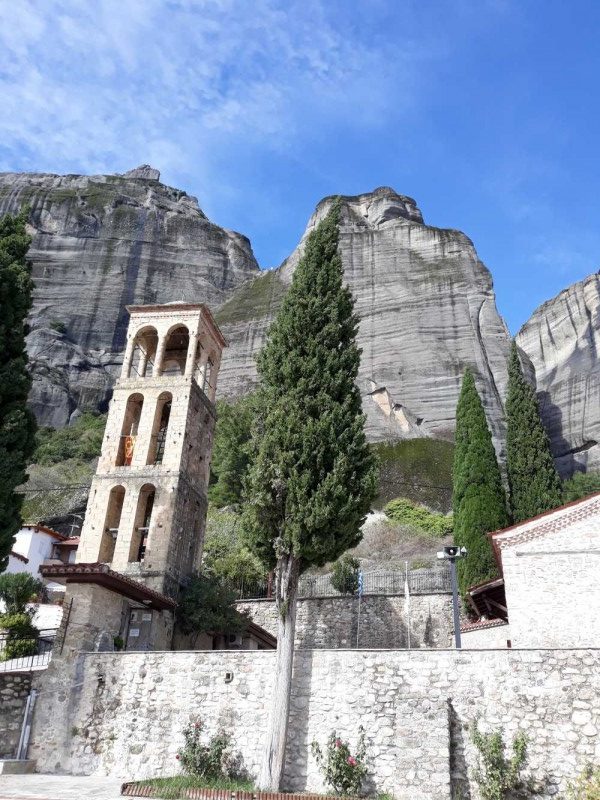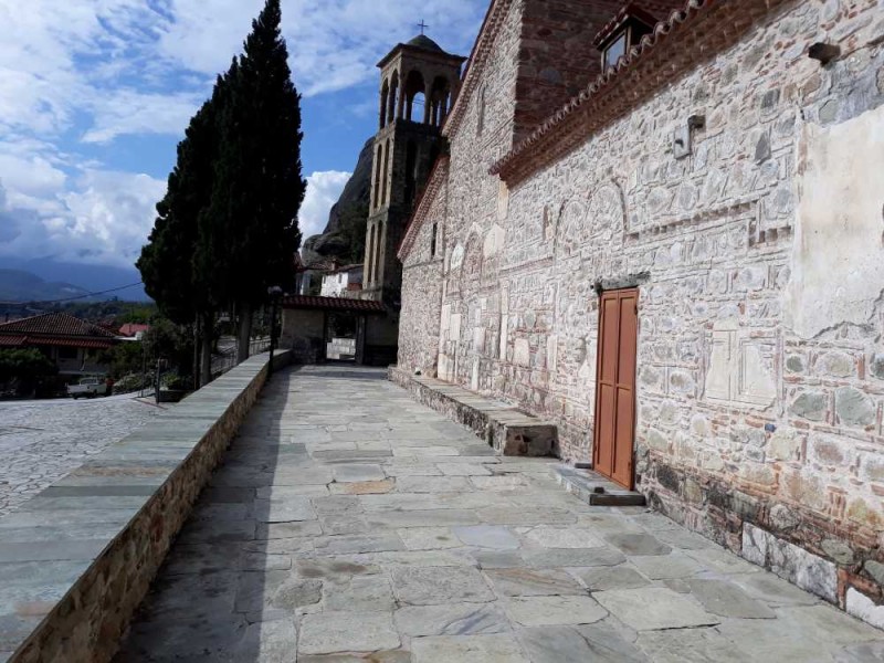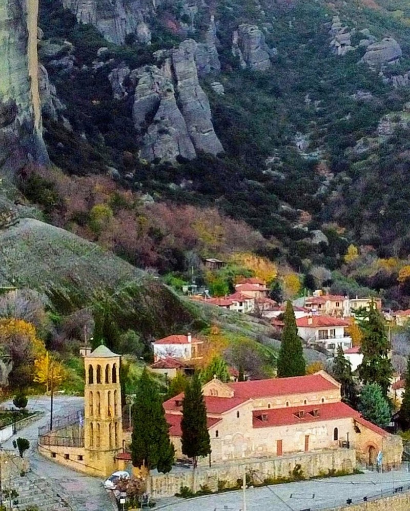 Εκεί, στη ρίζα των μετεωρίτικων Βράχων, μέσα στα στενά δρομάκια και στις αυλές σπιτιών με γεράνια και βασιλικούς, που δίνουν στη συνοικία έναν αέρα ελληνικού χωριού και όχι μιας, μικρής μεν αλλά σύγχρονης και δυναμικής, πόλης, βρίσκεται ο βυζαντινός ναός της Κοιμήσεως της Θεοτόκου.