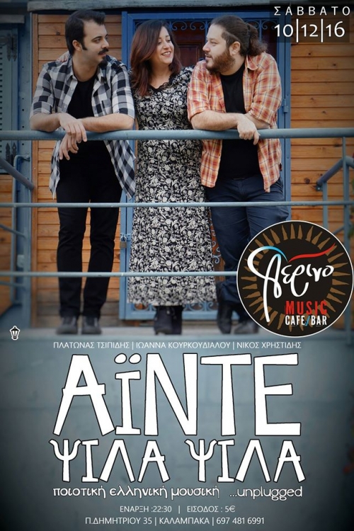Στα πλαίσια της περιοδείας των “Άιντε Ψιλά Ψιλά” σε όλο και περισσότερα μέρη της Ελλάδας, το σχήμα θα εμφανιστεί το Σάββατο 10 Δεκεμβρίου στον φιλόξενο χώρο “Αέρινο” στην Καλαμπάκα.