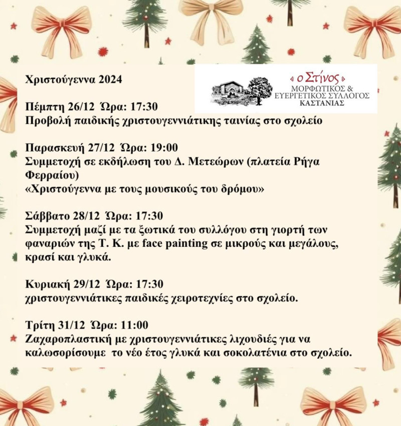 Οι εκδηλώσεις του ΜΕΣ Καστανιάς “Ο Στίνος” για τα Χριστούγεννα Ανακοινώσεις Από admin Δημοσίευση Δεκ 12, 2024 -23:27 0 244 Κοινοποίηση FacebookTwitterΗλεκτρονικό ΤαχυδρομείοViber Μια σειρά από εκδηλώσεις έχει ετοιμάσει ο Μορφωτικός και Ευεργετικός Σύλλογος Καστανιάς “Ο ΣΤΙΝΟΣ” για τις μέρες των Χριστουγέννων. Το πρόγραμμα έχει ως εξής: 0 244 Κοινοποίηση
