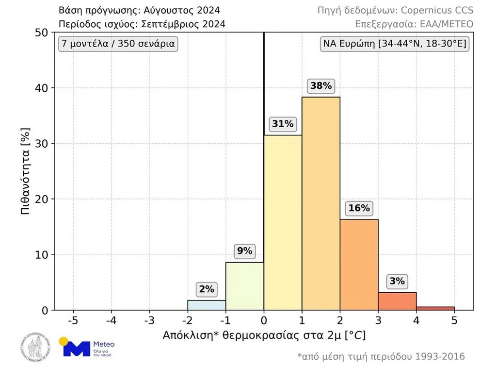 Όπως φαίνεται σε γράφημα του meteo, σύμφωνα με το 89% των διαθέσιμων σεναρίων η μέση θερμοκρασία Σεπτεμβρίου θα είναι υψηλότερη από τα κανονικά για την εποχή επίπεδα (περίοδος αναφοράς: 1993-2016).