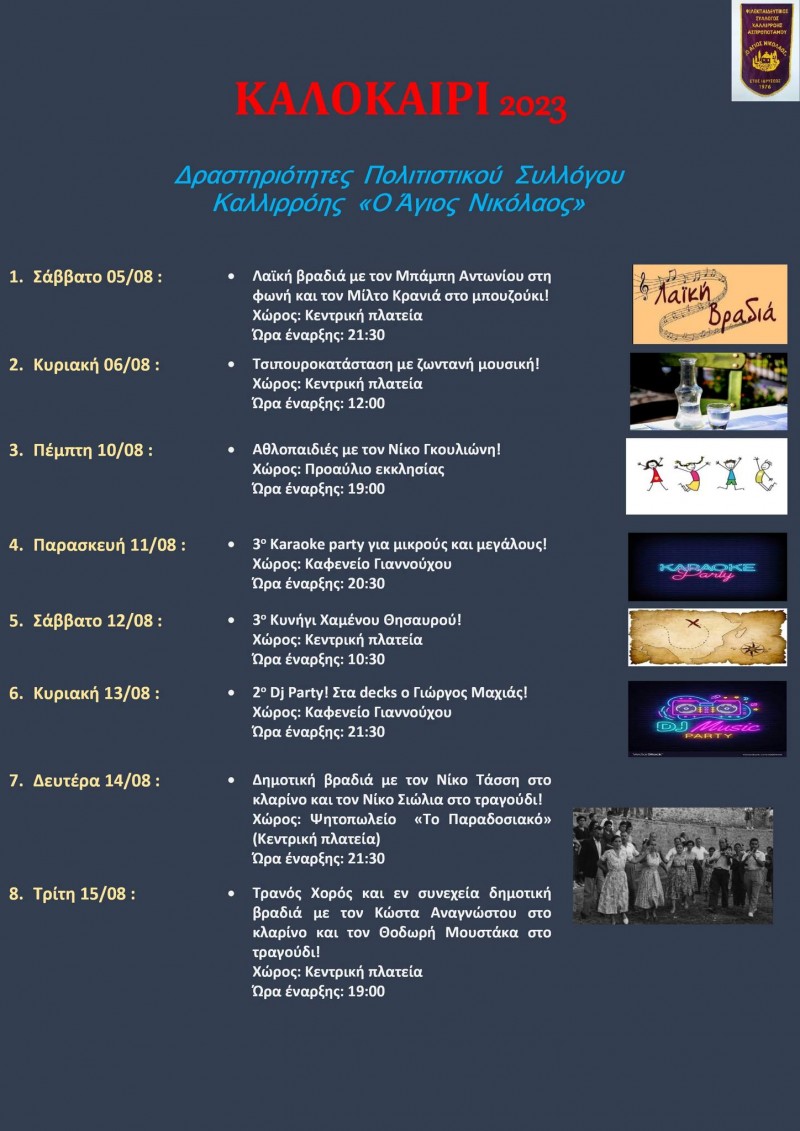 Οι καλοκαιρινές εκδηλώσεις του Πολιτιστικού Συλλόγου Καλλιρρόης ” Ο Άγιος Νικόλαος” Ανακοινώσεις Από admin Δημοσίευση Ιούλ 18, 2023 -21:46 0 1.316 Κοινοποίηση FacebookTwitterΗλεκτρονικό ΤαχυδρομείοViber Μια σειρά από εκδηλώσεις έχει ετοιμάσει για το φετινό καλοκαίρι ο Πολιτιστικός Σύλλογος Καλλιρρόης ” Ο Άγιος Νικόλαος”. Εκδηλώσεις ξεκινούν από την 1η Αυγούστου και θα διαρκέσουν έως τις 9 Αυγούστου και έχουν ώς εξής: ΠΟΛΙΤΙΣΤΙΚΟΣ ΣΥΛΛΟΓΟΣ ΚΑΛΛΙΡΡΟΗΣ 0 1.316 Κοινοποίηση
