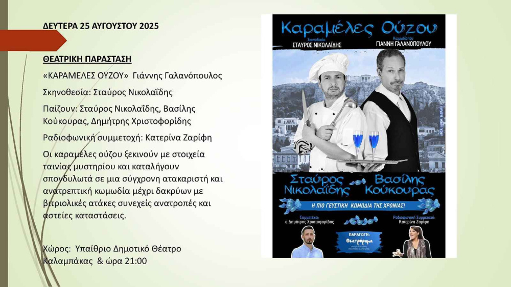 Ο Δήμος Μετεώρων, στο πλαίσιο του πολιτιστικού προγράμματος «Μετέωρα Τέχνης 2025», παρουσιάζει τη θεατρική παράσταση «Καραμέλες Ούζου» του Γιάννη Γαλανόπουλου, τη Δευτέρα 25 Αυγούστου 2025 και ώρα 21:00, στο Υπαίθριο Δημοτικό Θέατρο Καλαμπάκας.