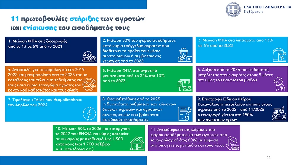 Ανάμεσα σε αυτές περιλαμβάνονται: μείωση ΦΠΑ στις ζωοτροφές από το 13 σε 6% από το 2021, μείωση 50% του φόρου εισοδήματος κατά κύριο επάγγελμα αγροτών, μείωση ΦΠΑ στα λιπάσματα από 13% σε 6% από το 2022, αναστολή για τα φορολογικά έτη 2019–2022 και μονιμοποίηση από το 2023 της μη καταβολής του τέλους επιτηδεύματος για τους κατά κύριο επάγγελμα αγρότες του κανονικού καθεστώτος και τους αλιείς κ.α..