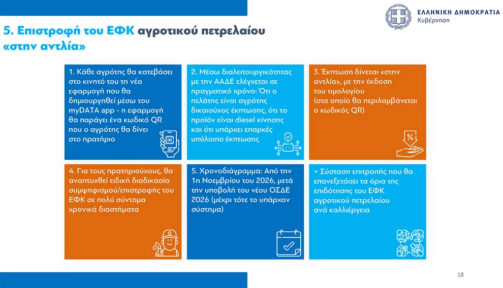 Ο υφυπουργός Οικονομικών, Θάνος Πετραλιάς αναφερόμενος στη συγκεκριμένη πρωτοβουλία σχετικά με την επιστροφή Ειδικού Φόρου Κατανάλωσης αγροτικού πετρελαίου στην αντλία είπε ότι κάθε αγρότης θα κατεβάσει στο κινητό του τη νέα εφαρμογή που θα δημιουργηθεί μέσω του myDATA app – η εφαρμογή θα παράγει ένα κωδικό QR που ο αγρότης θα δίνει στο πρατήριο.