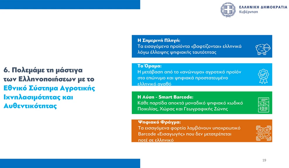 Ο υπουργός Ψηφιακής Διακυβέρνσης, Δημήτρης Παπαστεργίου, σημείωσε πως με το καινοτόμο σύστημα Εθνικής Ιχνηλάτησης καταγράφεται τι συμβαίνει με τα ελληνικά προϊόντα, καθώς σήμερα δεν αναγράφεται με σαφήνεια η προέλευση, και γι’ αυτό εισάγεται κωδικοποίηση ώστε κάθε ελληνικό προϊόν να διαθέτει μοναδικό barcode που το ακολουθεί από το χωράφι στο ράφι, επιτρέποντας να γνωρίζουμε πόσα προϊόντα στα ράφια είναι ελληνικά και πόσα φέρουν εισαγόμενο barcode.