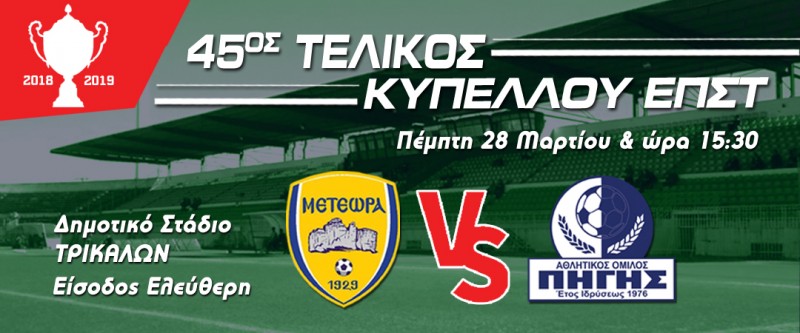 Όλα είναι έτοιμα για τον 45ο τελικό κυπέλλου της ΕΠΣΤ ο οποίος θα διεξαχθεί την Πέμπτη 28 Μαρτίου και ώρα 3.30 στο Δημοτικό στάδιο με φιναλίστ τα Μετέωρα και την Πηγή.