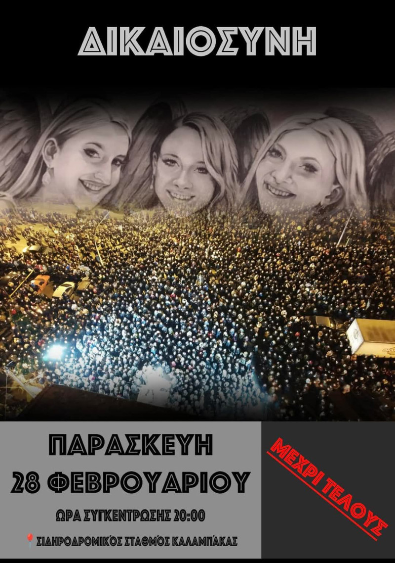 Όλη Καλαμπάκα και η περιοχή καλείται σήμερα να δώσει δυναμική παρουσία για την Χρύσα, την Θώμη, την Αναστασία και για όλα τα θύματα των Τεμπών στον Σιδηροδρομικό Σταθμό Καλαμπάκας για την δικαίωσή τους και την αλήθεια για το σιδηροδρομικό δυστύχημα της 28ης Φεβρουαρίου 2023.