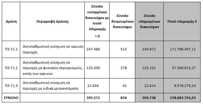 Ολοκληρώθηκε, σήμερα, από τον Ο.Π.Ε.Κ.Ε.Π.Ε. η καταβολή ποσού ύψους 238.683.791,63 ευρώ σε συνολικά 394.738 δικαιούχους της Παρέμβασης Π3-71 για το έτος 2024, σύμφωνα με την υπ’ αριθ. 406929/24.12.2024 τροποποίηση της απόφασης με αριθ. 392353/12.12.2024 του Γενικού Γραμματέα Ενωσιακών Πόρων και Υποδομών περί Ένταξης Πράξεων στη Παρέμβαση Π3-71 «Ενισχύσεις σε περιοχές που χαρακτηρίζονται από φυσικά ή άλλα ειδικά μειονεκτήματα» του Στρατηγικού Σχεδίου Κοινής Αγροτικής Πολιτικής 2023-27 (ΣΣ ΚΑΠ).