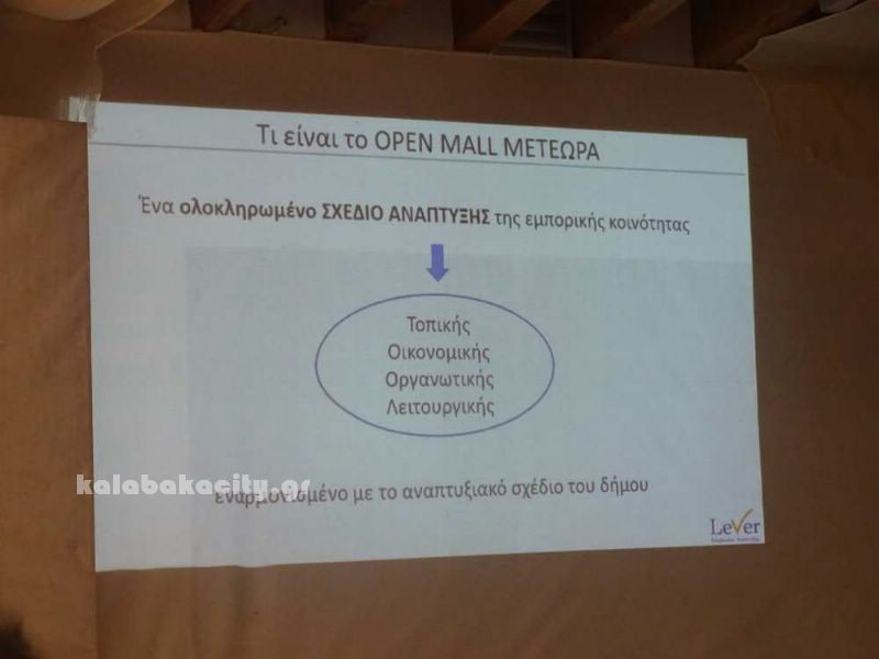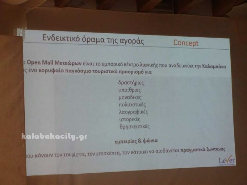 Στην αίθουσα Νίτσα Λιάπη της πόλης μας έγινε το βράδυ της Τρίτης παρουσίαση σχετικά με το πρόγραμμα και την πρόταση από την εταιρεία «LEVER» που έχει αναλάβει τη μελέτη για το πρόγραμμα Open Mall Μετέωρα.