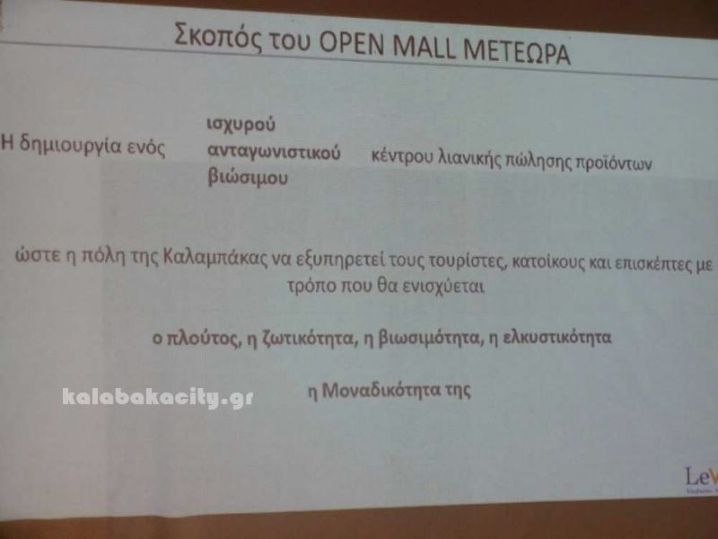 Στην ενημερωτική συνάντηση έδωσαν το παρόν επαγγελματίες της πόλης μας οι οποίοι έμαθαν τι είναι το Open Mall Μετέωρα, τον σκοπό του που είναι η δημιουργία ενός ισχυρού, ανταγωνιστικού βιώσιμου κέντρου λιανικής πώλησης προϊόντων ώστε η Καλαμπάκα να εξυπηρετεί τους τουρίστες, κατοίκους και επισκέπτες με τρόπο που θα ενισχύεται ο Πλούτος, ζωτικότητα, η βιωσιμότητα, η ελκυστικότητα και η μοναδικότητας.
